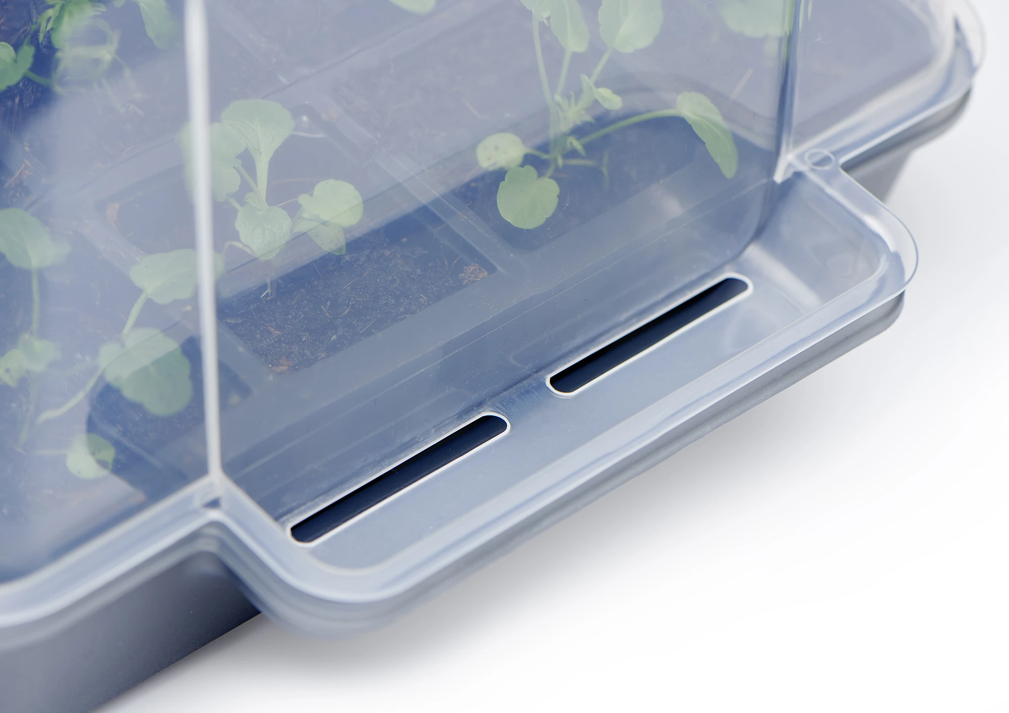 clever pots Gewächshaus schafft die ideale Umgebung für die Entwicklung von Samen zu gesunden Setzlingen. Der durchsichtige Boden macht den Wasserstand sichtbar, um Über- oder Unterbewässerung zu vermeiden. Das Kondenswasser wird zurück in die Bodenwanne geleitet. Dieses Gewächshaus passt auf alle Standard-Steckschalen, besteht aus PP-Kunststoff und ist recycelbar.