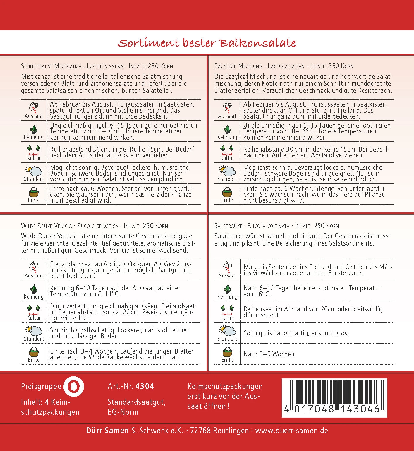 Sortiment mit vier verschiedenen Balkonsalaten, die ideal zum Kultivieren auf dem Balkon und in Kübeln geeignet sind. Die Sorten sind: Schnittsalat Eazyleaf, Schnittsalat Misticanza, Salatrauke, Wilde Rauke.