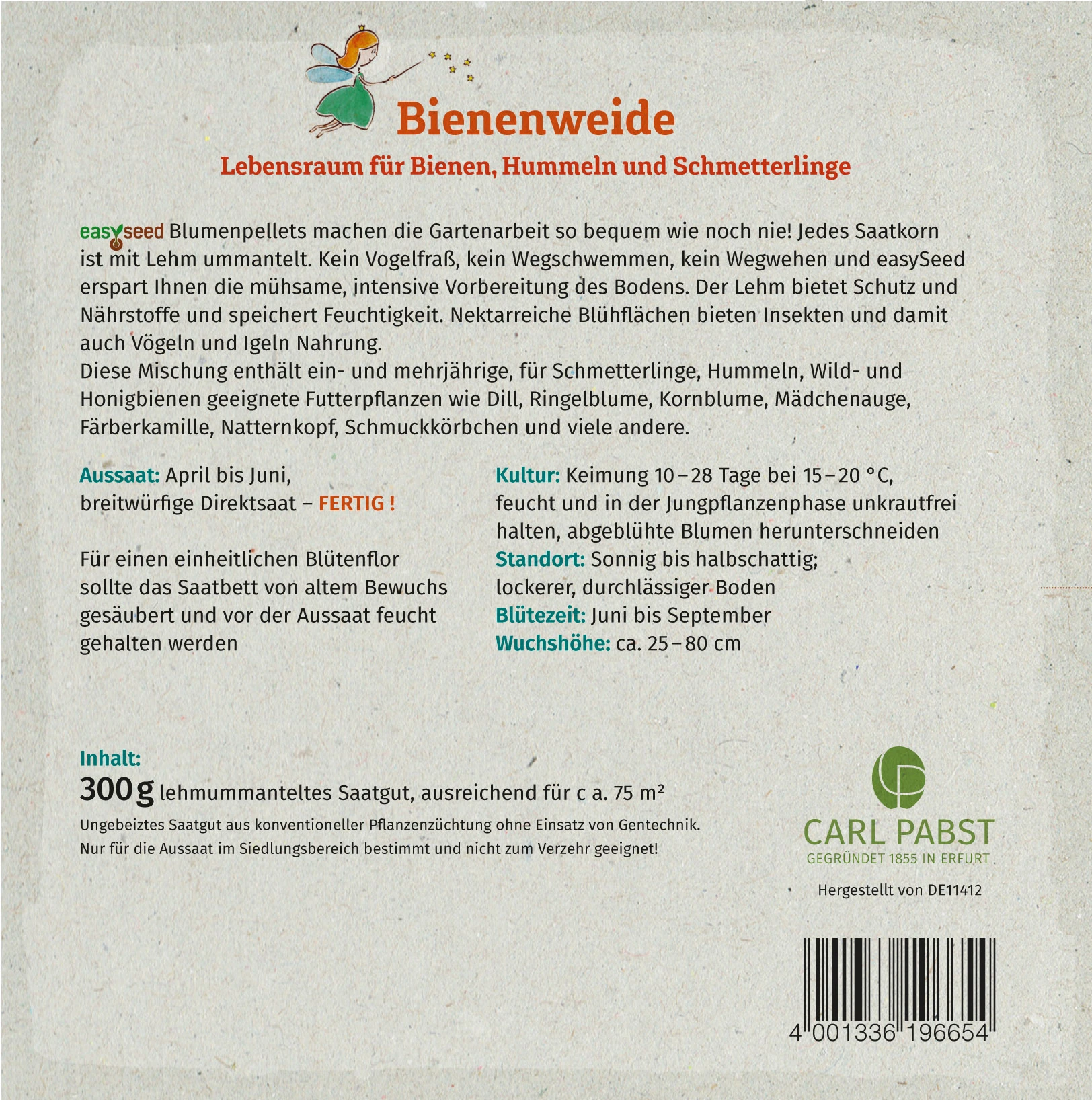 d Blumenpellets machen die Gartenarbeit so bequem wie noch nie! Jedes Saatkorn ist mit Lehm ummantelt. Kein Vogelfraß, kein Wegschwemmen, kein Wegwehen und easySeed erspart Ihnen die mühsame, intensive Vorbereitung des Bodens. Der Lehm bietet Schutz und Nährstoffe und speichert Feuchtigkeit. Nektarreiche Blühflächen bieten Insekten und damit auch Vögeln und Igeln Nahrung. Diese Mischung enthält ein- und mehrjährige, für Schmetterlirige, Hummeln, Wild- und Honigbienen geeignete Futterpflanzen wie Dill, Ringelblume, Kornblume, Mädchenauge, Färberkamille, Natternkopf, Schmuckkörbchen und viele andere.