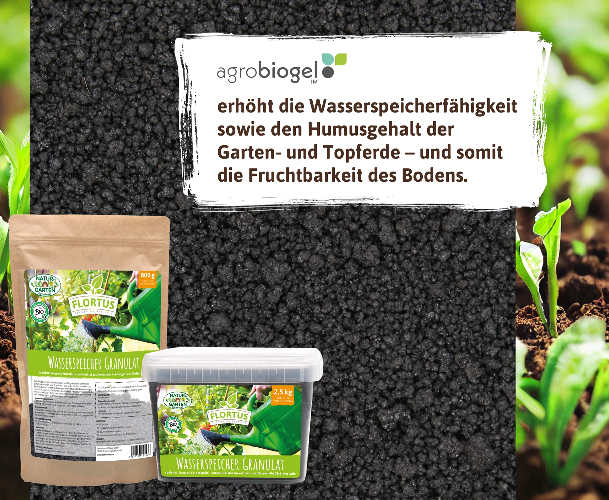 AgroBiogel erhöht die Wasserspeicherfähigkeit sowie den Humusgehalt der Garten- und Topferde – und somit die Fruchtbarkeit des Bodens. Bei trockenen Bedingungen bzw. reduzierter Bewässerungsintensität sorgt das Gel für eine kontinuierliche Wasserversorgung der Pflanze, reduziert damit den durch Trockenheit verursachten Stress der Pflanzen und sorgt für ein gesundes Wachstum.