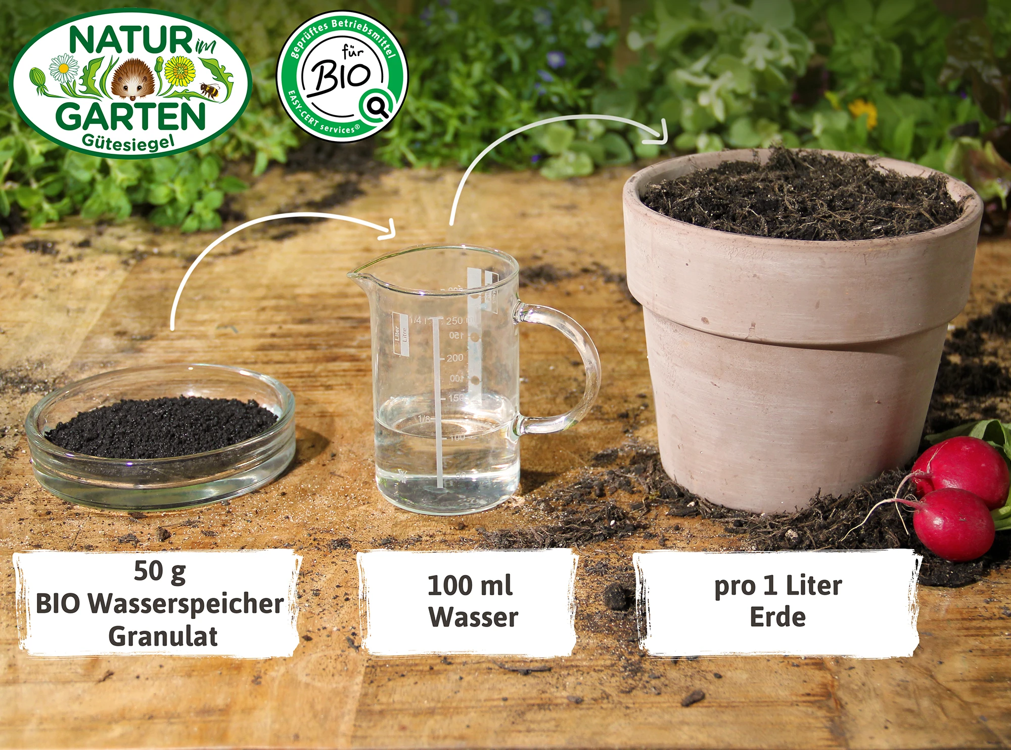 Das Granulat zuerst in einem Gefäß mit ausreichend Wasser aufquellen lassen, anschließend mit Erde vermischen. Das Vermischen im trockenen Zustand ist möglich, allerdings danach genügend Wasser hinzufügen um das Gel zu aktivieren. Die Ausbringung sollte im Wurzelbereich der Pflanzen erfolgen. Die Anwendung direkt an der Oberfläche wird nicht empfohlen.