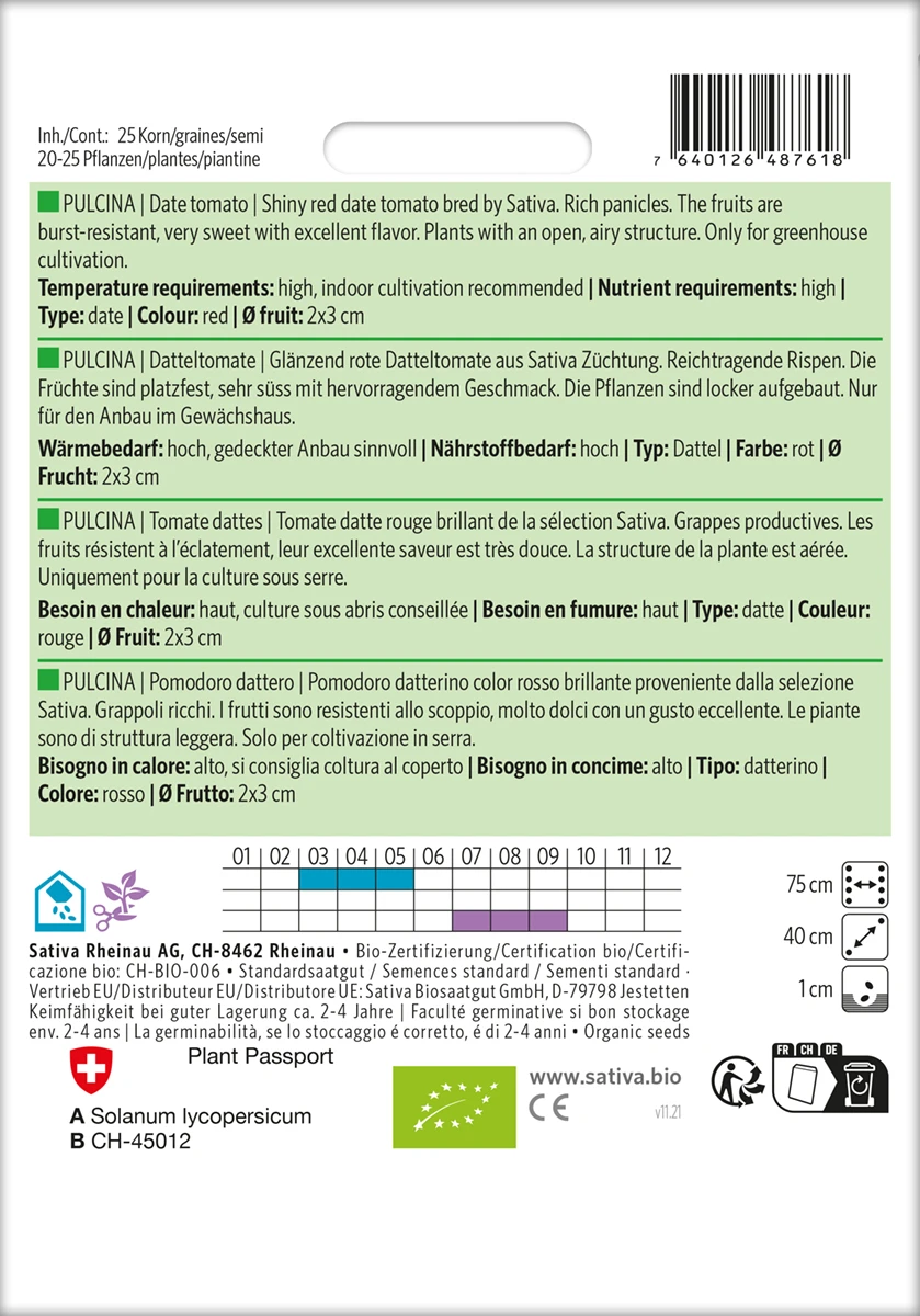 Glänzend rote Datteltomate aus Sativa Züchtung. Reichtragende Rispen. Die Früchte sind platzfest, sehr süss mit hervorragendem Geschmack. Die Pflanzen sind locker aufgebaut. Nur für den Anbau im Gewächshaus.