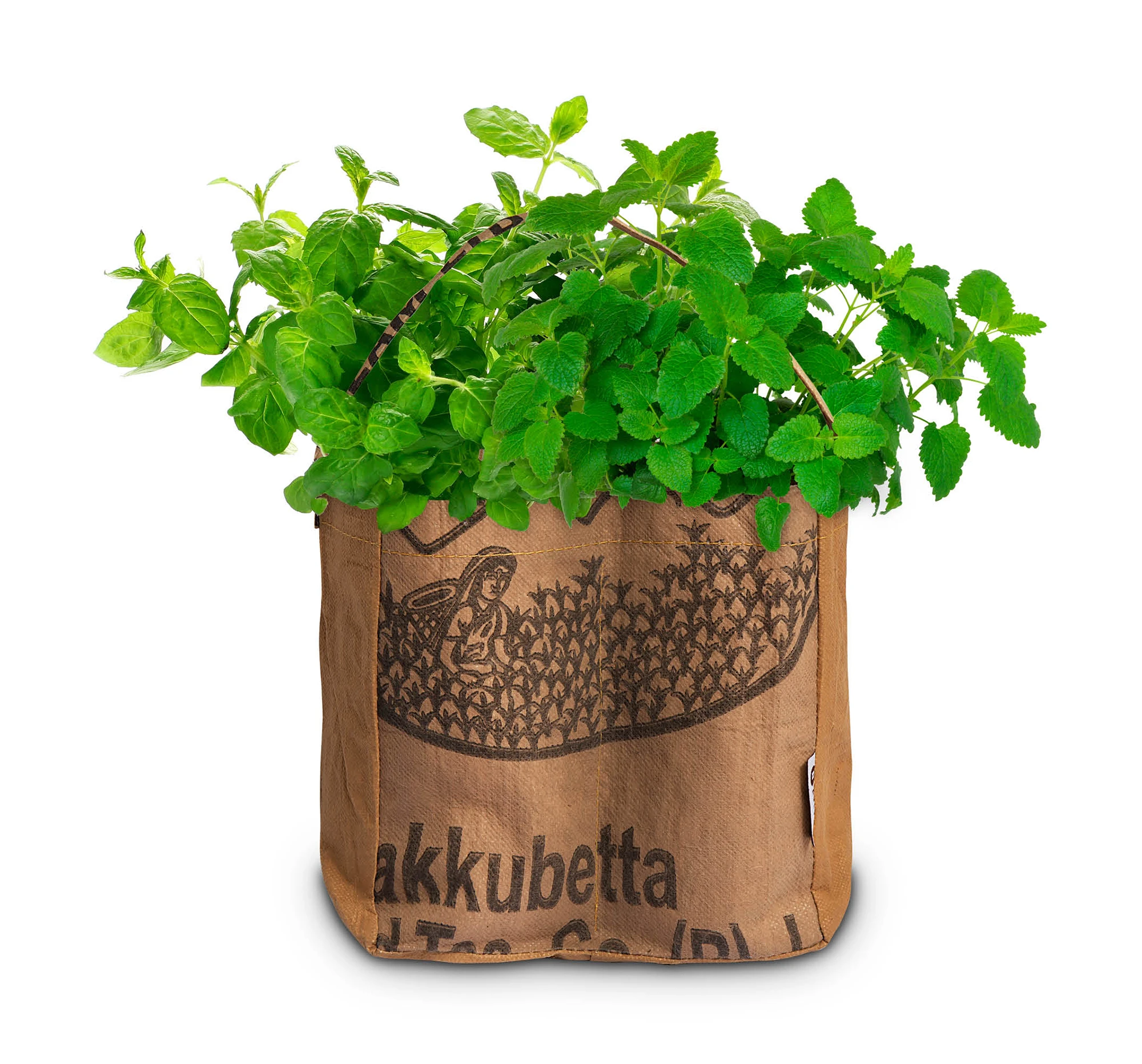 Jeder Beutel ist mit einem einzigartigen Motiv versehen, da er aus gebrauchten Verpackungsballen von Teeplantagen in Indien recycelt wurde! Dank dieses Fair-Trade-Projekts haben viele Menschen ein neues Einkommen und wir setzen Rohstoffe nachhaltig ein.