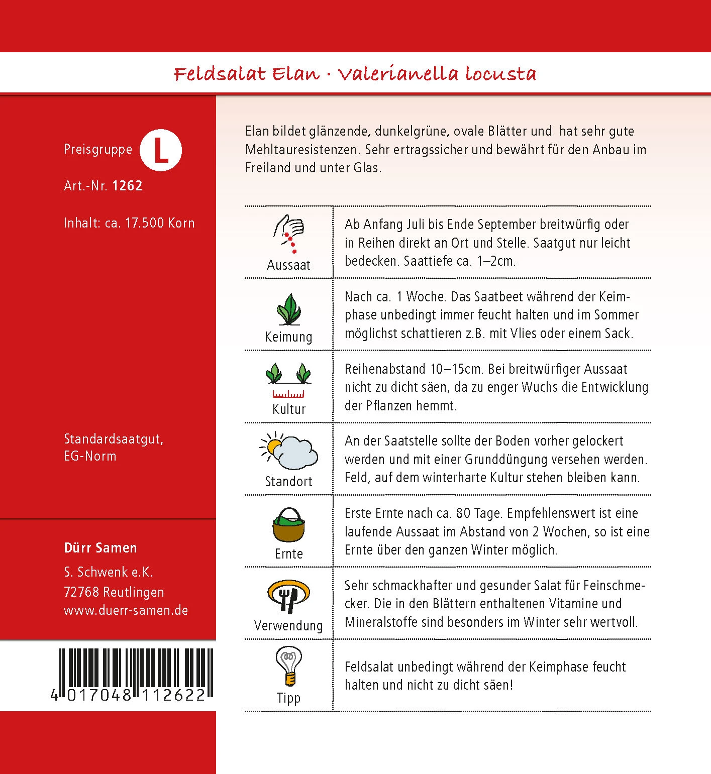 Erste Ernte nach ca. 80 Tage. Empfehlenswert ist eine laufende Aussaat im Abstand von 2 Wochen, so ist eine Ernte über den ganzen Winter möglich.