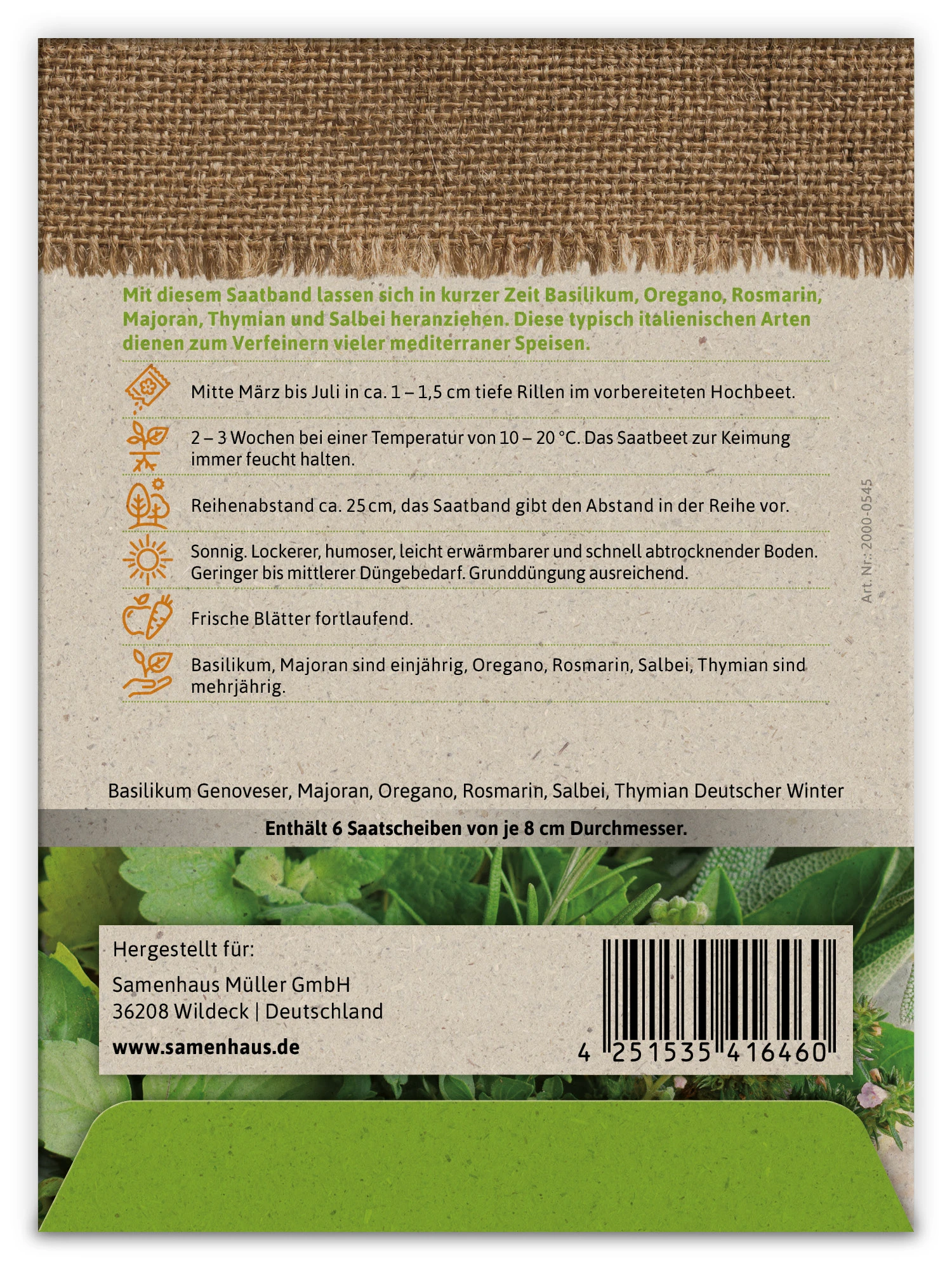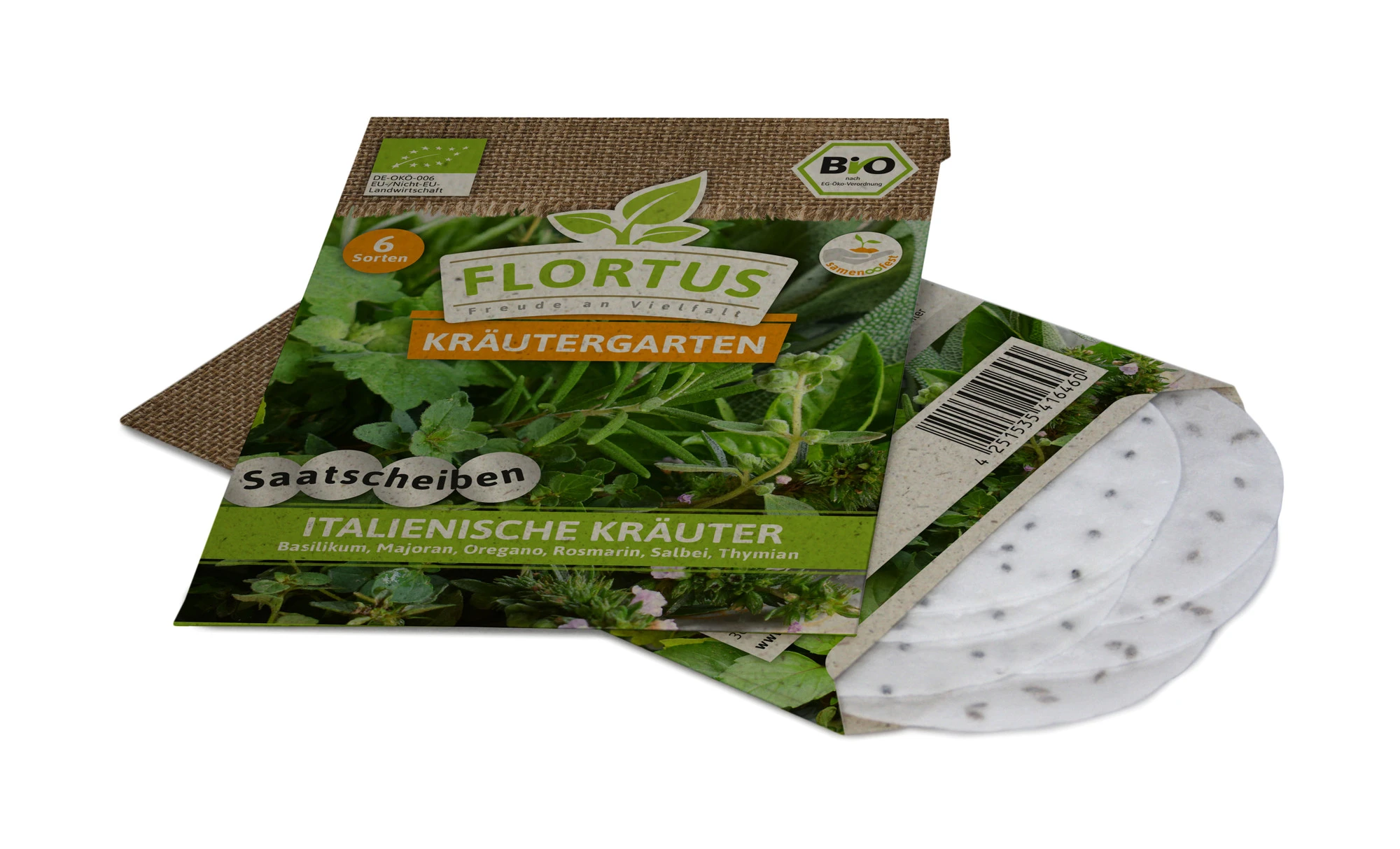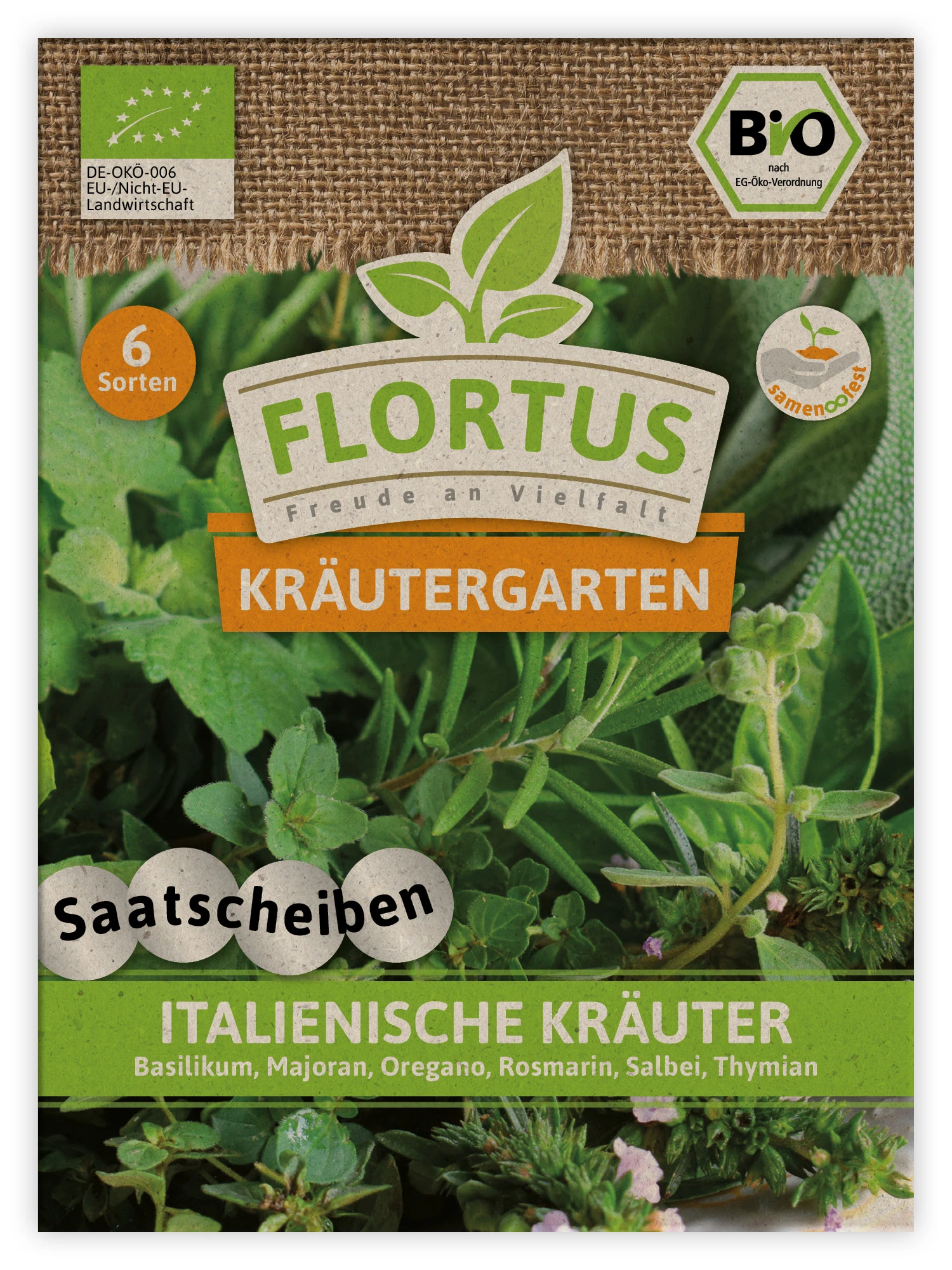 Mit diesen Saatscheiben lassen sich in kurzer Zeit Basilikum, Oregano, Rosmarin, Majoran, Thymian und Salbei heranziehen. Diese typisch italienischen Arten dienen zum Verfeinern vieler mediterraner Speisen.