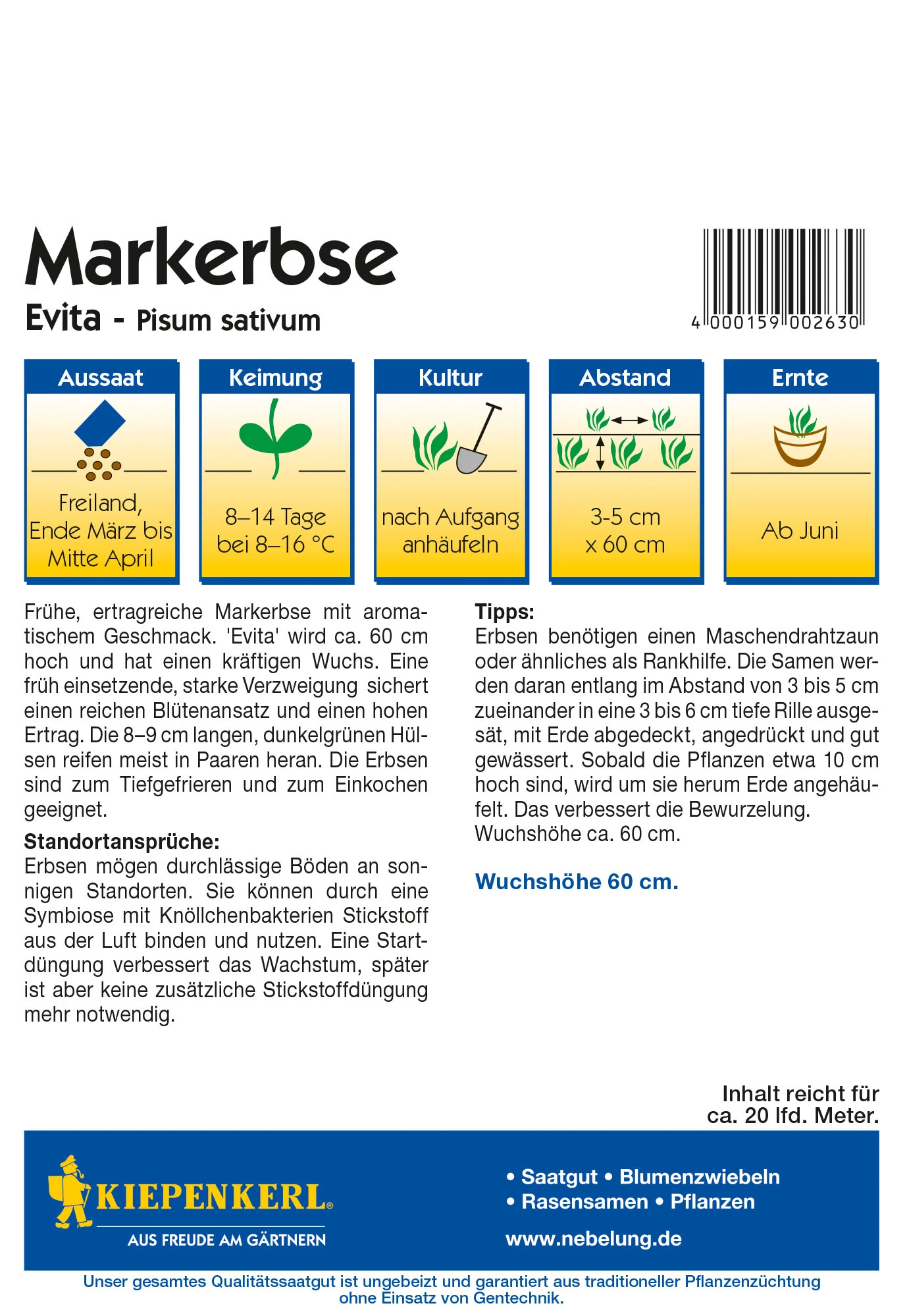 Mittelfrühe Sorte mit aromatischem Geschmack, dunklem Laub und kräftigem Wuchs. ‚Evita‘ wird ca. 60 cm hoch und die Pflanzen sind dicht besetzt mit paarigen, mittellangen, dunkel- bis mittelgrünen Hülsen. Die von unten schon beginnende starke Verzweigung sichert einen hohen Ertrag. Das Korn ist mittelgroß, mittelgrün und feinschalig. Tiefgefriersorte.