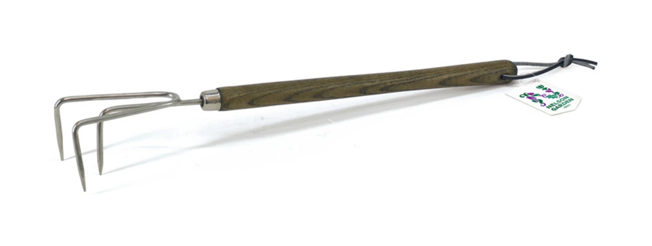 Handkultivator, geeignet für den Einsatz in Hochbeeten, wie z. B. in Palettenrahmen. Dieses Gartengerät ist funktionell, qualitativ hochwertig und aus schwarz lackiertem Stahl mit einem Griff aus FSC-zertifizierter Esche gefertigt.