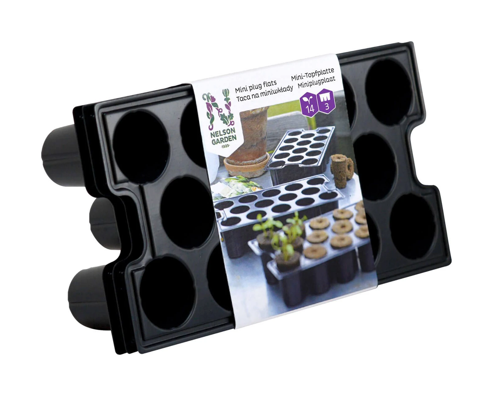 Kleine Topfplatte mit 14 Töpfen für Erde oder Quelltabletten. Vereinfacht Aussaat, Vorkultur und Umtopfen. Auf einem Untersetzer oder in einer Schale anordnen, mit Plastikfolie oder Deckel abdecken. Aus Polystyrol (PS).