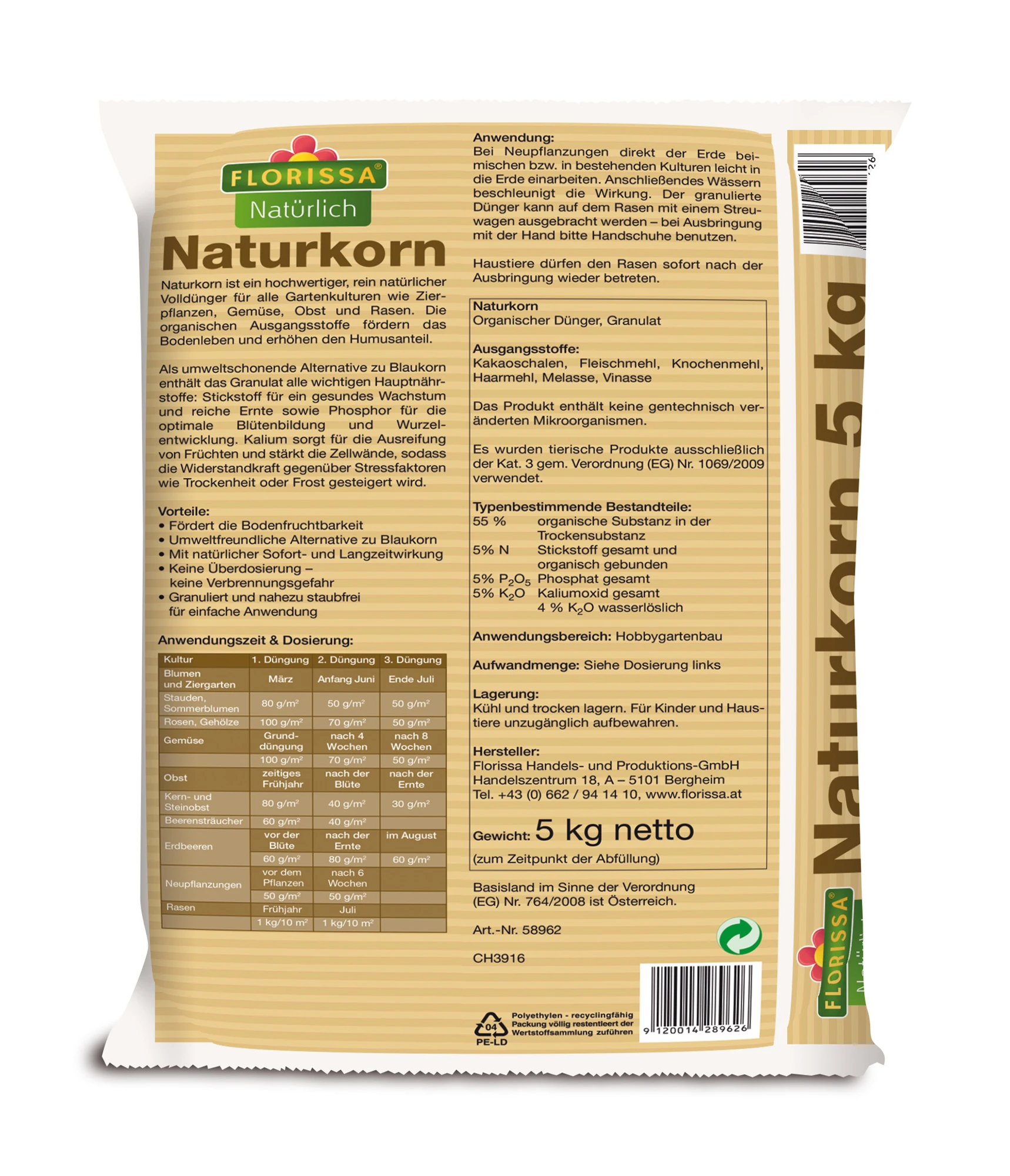 Dieser hochwertige, rein natürlicher Volldünger ist eine umweltschonende, biologische Alternative zu chemischen Düngern und eignet sich für alle Gartenkulturen wie Zierpflanzen, Gemüse, Obst und Rasen. Die organischen Ausgangsstoffe fördern das Bodenleben, erhöhen den Humusanteil und sorgen so für ein gesundes Wachstum und reiche Ernte. Naturkorn hat von Natur aus eine Sofort- und Langzeitwirkung und macht Pflanzen widerstandsfähig gegenüber Stressfaktoren wie Trockenheit oder Frost. Durch seine pelletierte Form ist es einfach anzuwenden und auszubringen.