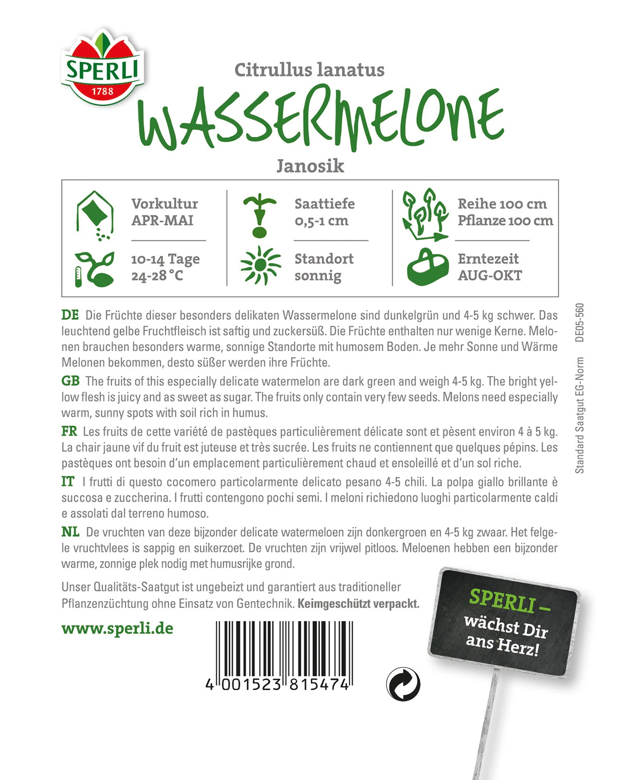 Die dunkelgrünen Früchte dieser besonders delikaten Wassemelone sind dunkelgrün und 4 – 5 kg schwer. Das leuchtend gelbe Fruchtfleisch ist saftig und zuckersüß. Die Früchte enthalten nur wenige Kerne. Melonen brauchen besonders warme, sonnige Standorte mit humosen Boden. Je mehr Sonne und Wärme Melonen bekommen, desto süßer werden ihre Früchte.