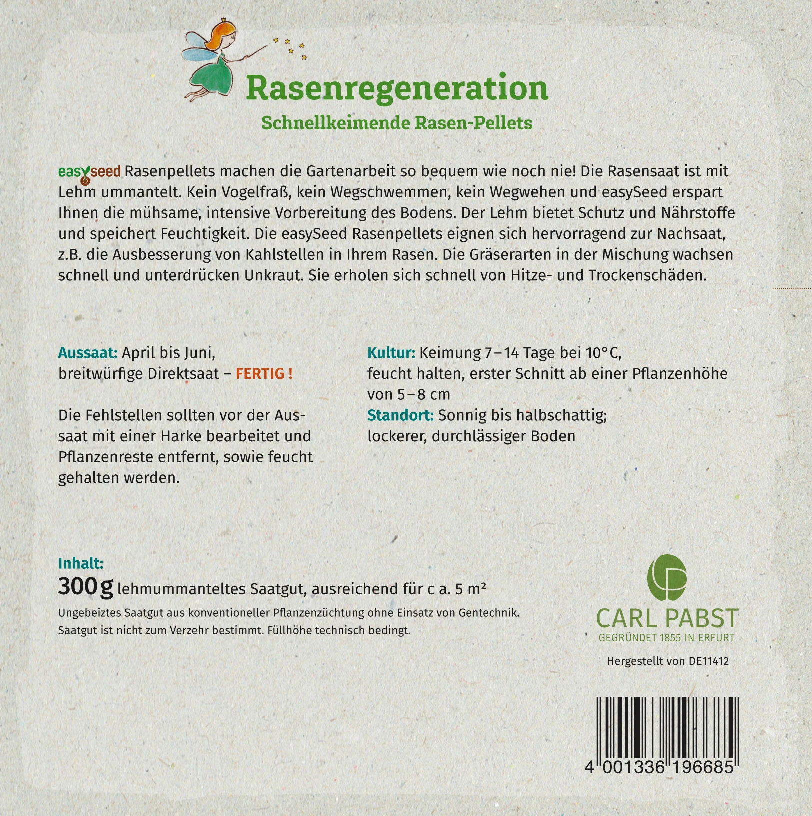 Rasenpellets machen die Gartenarbeit so bequem wie noch nie! Die Rasensaat ist mit Lehm ummantelt. Kein Vogelfraß, kein Wegschwemmen, kein Wegwehen und easySeed erspart Ihnen die mühsame, intensive Vorbereitung des Bodens. Der Lehm bietet Schutz und Nährstoffe und speichert Feuchtigkeit. Die easySeed Rasenpellets eignen sich hervorragend zur Nachsaat, z.B. die Ausbesserung von Kahlstellen in Ihrem Rasen. Die Gräserarten in der Mischung wachsen schnell und unterdrücken Unkraut. Sie erholen sich schnell von Hitze- und Trockenschäden.