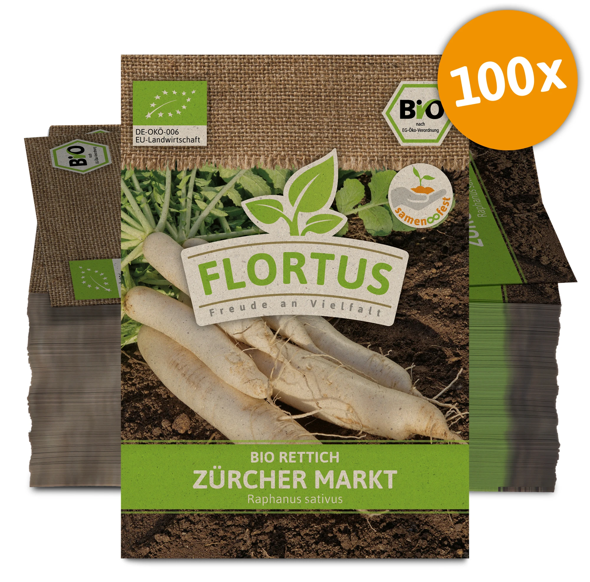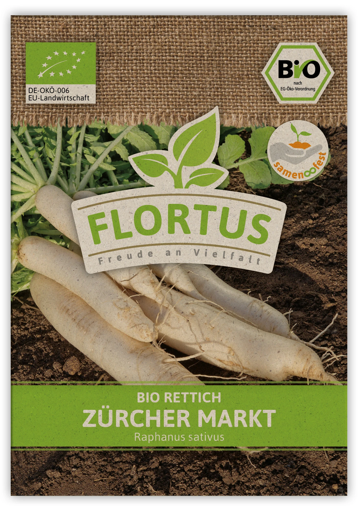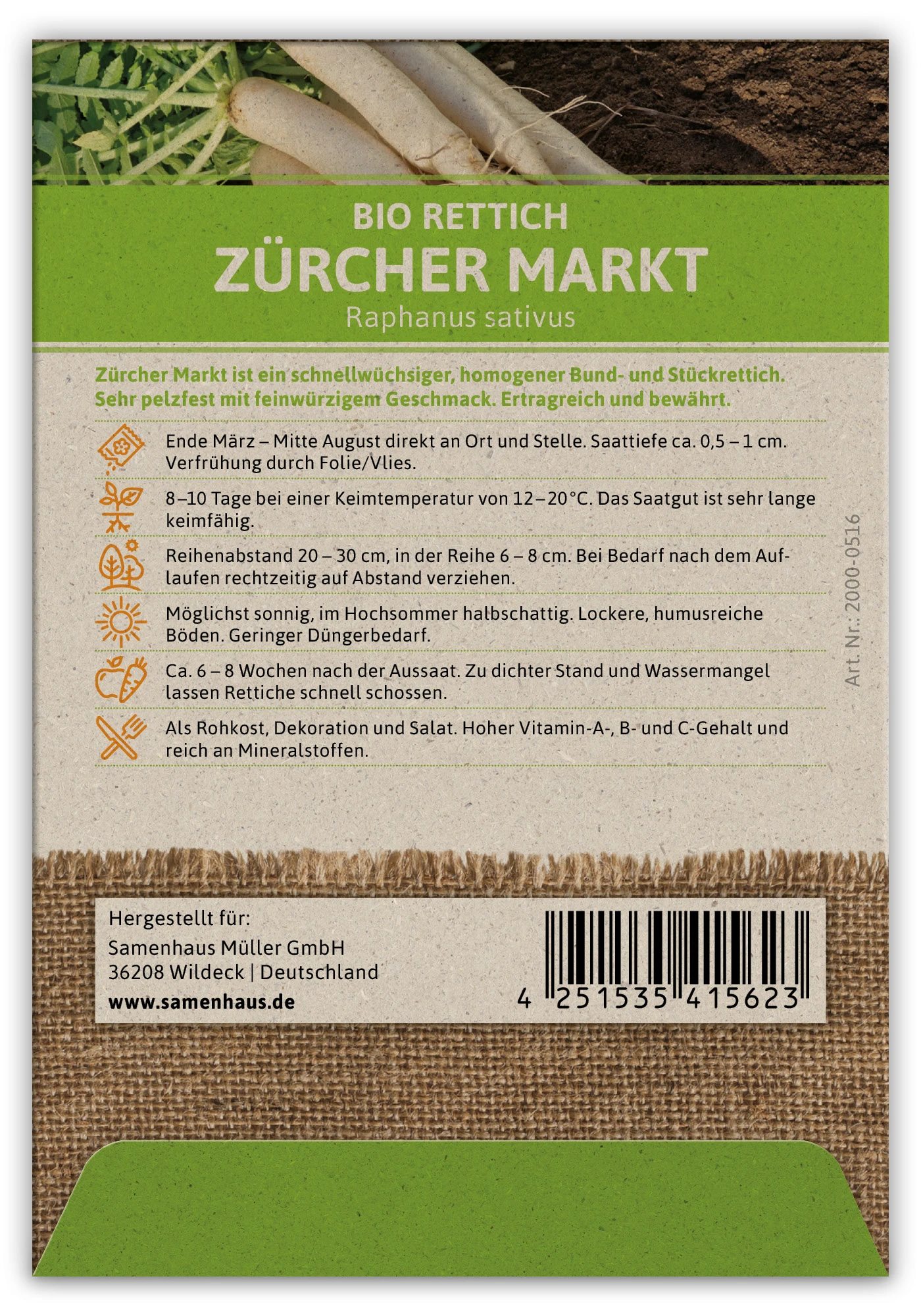 Rettich Zürcher Markt ist ein schnellwüchsiger, homogener Bund- und Stückrettich. Sehr pelzfest mit feinwürzigem Geschmack. Ertragreich und bewährt.