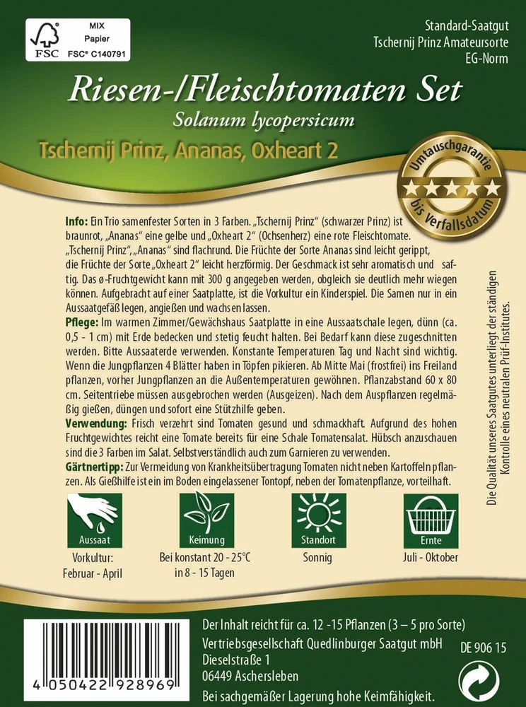 Ein Trio samenfester Sorten in 3 Farben. „Tschernij Prinz“ (schwarzer Prinz) ist braunrot, „Ananas“ eine gelbe und „Oxheart 2“ (Ochsenherz) eine rote Fleischtomate. „Tschernij Prinz“, „Ananas“ sind flachrund. Die Früchte der Sorte Ananas sind leicht gerippt, die Früchte der Sorte „Oxheart 2“ leicht herzförmig. Der Geschmack ist sehr aromatisch und saftig. Das ⍉-Fruchtgewicht kann mit 300 g angegeben werden, obgleich sie deutlich mehr wiegen können. Aufgebracht auf einer Saatplatte, ist die Vorkultur ein Kinderspiel. Die Samen nur in ein Aussaatgefäß legen, angießen und wachsen lassen.
