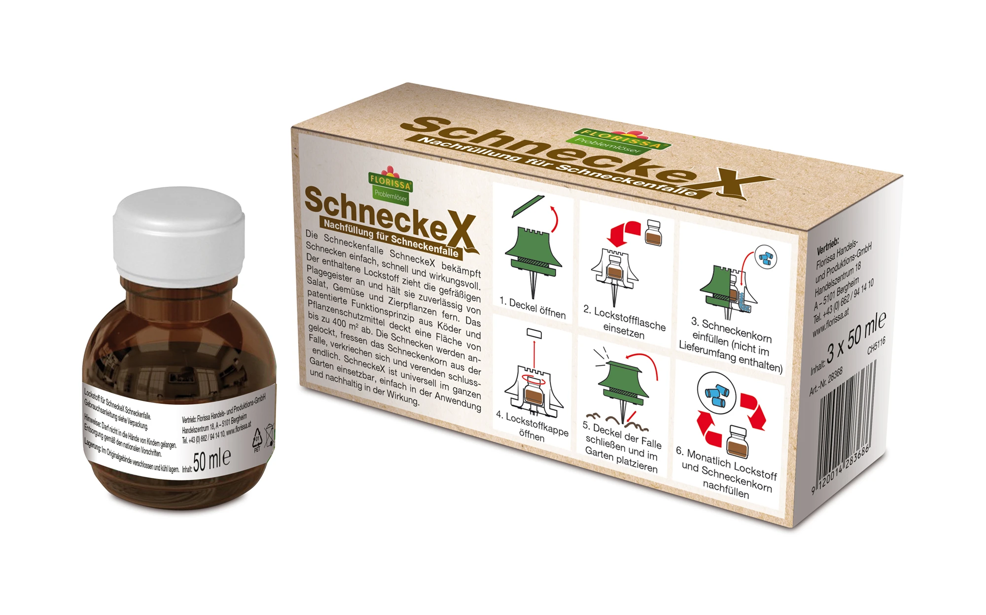 Die Schneckenfalle SchneckeX von Florissa ist wirklich effektiv! Das Lockmittel zieht die Schnecken zuverlässig an und die Falle ist einfach zu handhaben. Das Nachfüllpack mit 3x 50 ml reicht für eine ganze Saison. Sehr zufrieden!