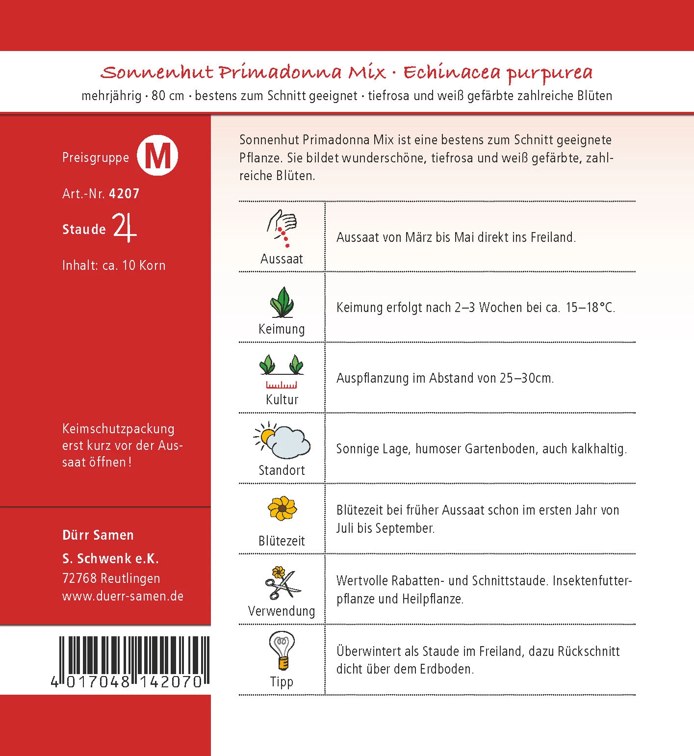 Keimung erfolgt nach 2–3 Wochen bei ca. 15–18°C.