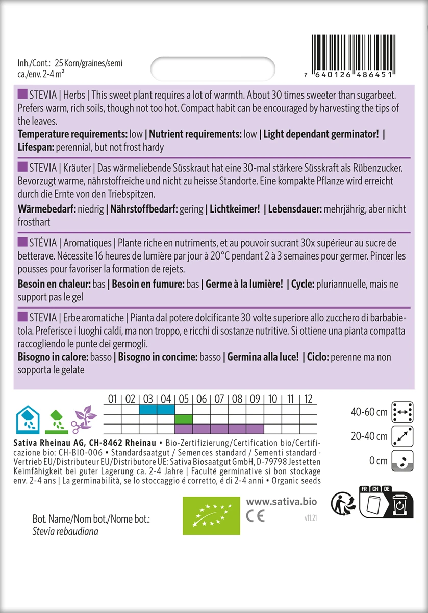 Das wärmeliebende Süsskraut hat eine 30-mal stärkere Süsskraft als Rübenzucker. Bevorzugt warme, nährstoffreiche und nicht zu heisse Standorte. Eine kompakte Pflanze wird erreicht durch die Ernte von den Triebspitzen.