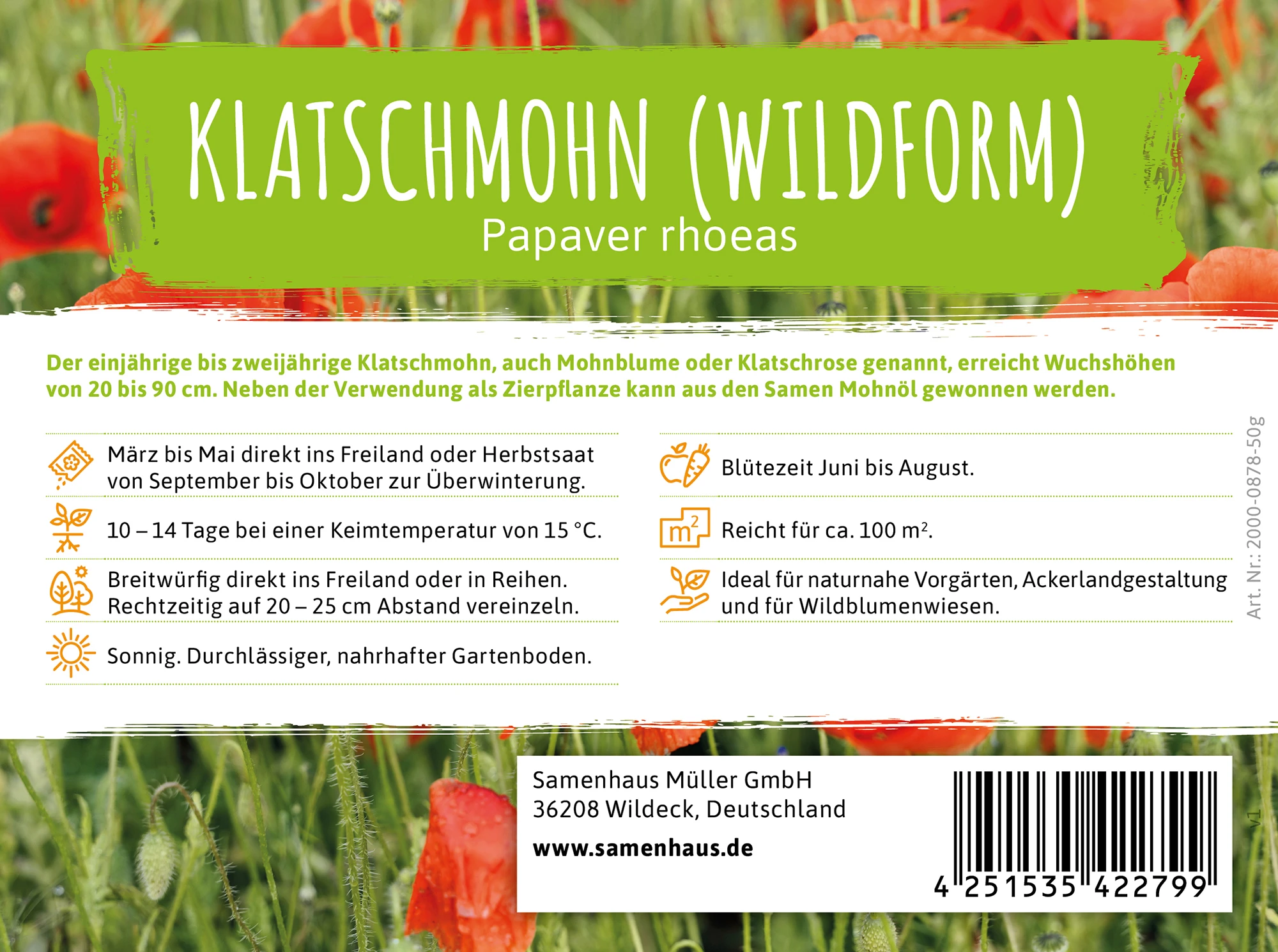 Das leuchtende Rot des Klatschmohns setzt natürlich Akzente auf jeder Wiese. Im Frühsommer sinddie Blumen ein wahrer Bienenmagnet, der zahlreiche Insekten anzieht. Klatschmohn ist eine sehr gute Nahrungsquelle für Insekten, denn die Pflanzen liefern die biologisch wirksamsten Pollen für Bienen. Die wunderbaren roten Blumen eigen sich zum Verwildern. Einst wurde Klatschmohn als Heilpflanze eingesetzt. Heute hat der Mohn dahingehend keine Bedeutung mehr. Klatschmohn ist sehr pflegeleicht. Die einjährigen Pflanzen säen sich selbst aus und kommen so im nächsten Jahr wieder. Säen Sie den Klatschmohnsamen zwischen März und April an Ort und Stelle aus. Die Samen sind Lichtkeimer und sollten deshalb nur leicht angedrückt werden.