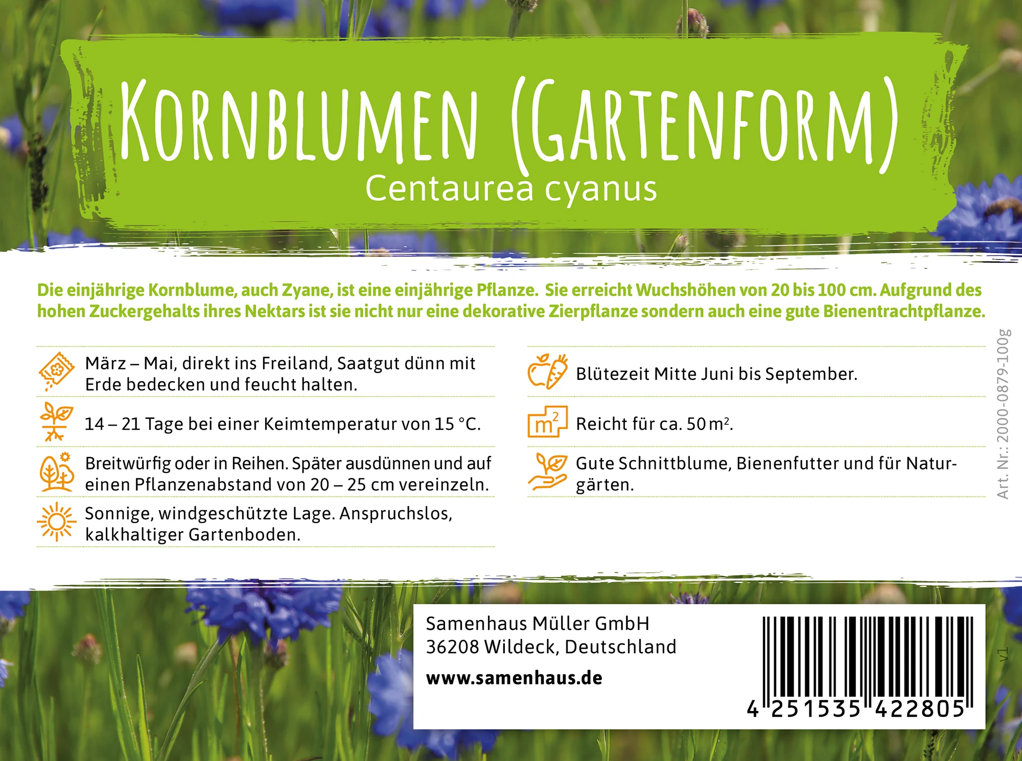 Kornblumen gehören zu den schönsten Wiesenblumen. Ihre feinen, blauen Blüten sind schon von Weitem zu sehen. Die Blumen gehören unbedingt zu Naturgärten, wirken aber auch auf Wiesen undFeldrändern sehr attraktiv. Kornblumen sind wertvolle Nektarpflanzen für Bienen, Hummeln, Schmetterlinge und andere Insekten. Besonders Waldbienen werden von dem Duft und dem hohen Nektargehalt angezogen. Die Kornblume gehört aber auch zu den wichtigen Heilpflanzen. Kornblumen sind recht anspruchslos. Sie mögen einen vollsonnigen Standort und einen humusreichen und frischen Boden. Säen Sie die Blumen zwischen März und Juli direkt an Ort und Stelle aus. Von Mai bis September können Sie sich dann an dem faszinierenden Blau der Kornblumen erfreuen.