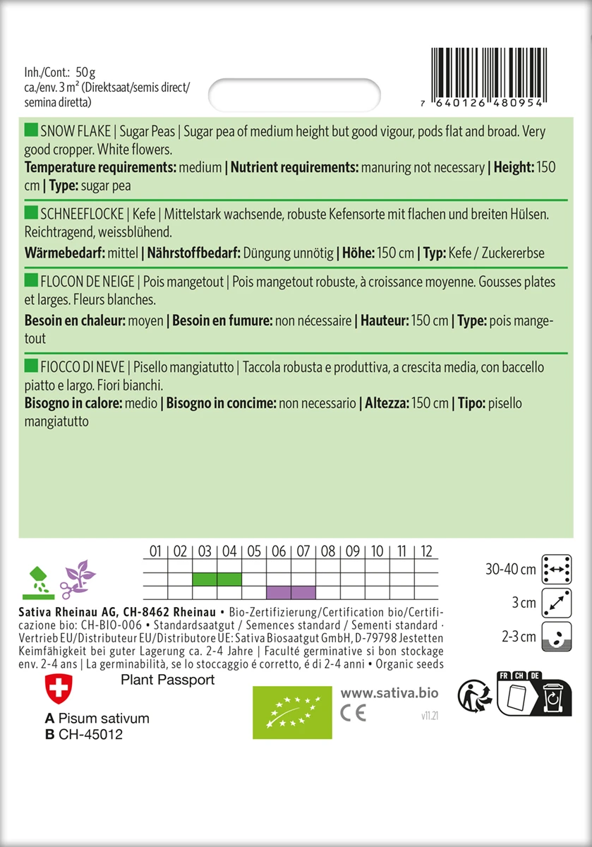 Erde gut lockern und grobkrümelig belassen. Keine Leguminosen als Vorfrucht, keine Düngung nötig. Anbaupause nach Erbsen 4 – 7 Jahre. Samen etwa 3 cm tief säen. Frühe Saaten entwickeln sich meist besser als späte. Höher wachsende Sorten aufreisern.