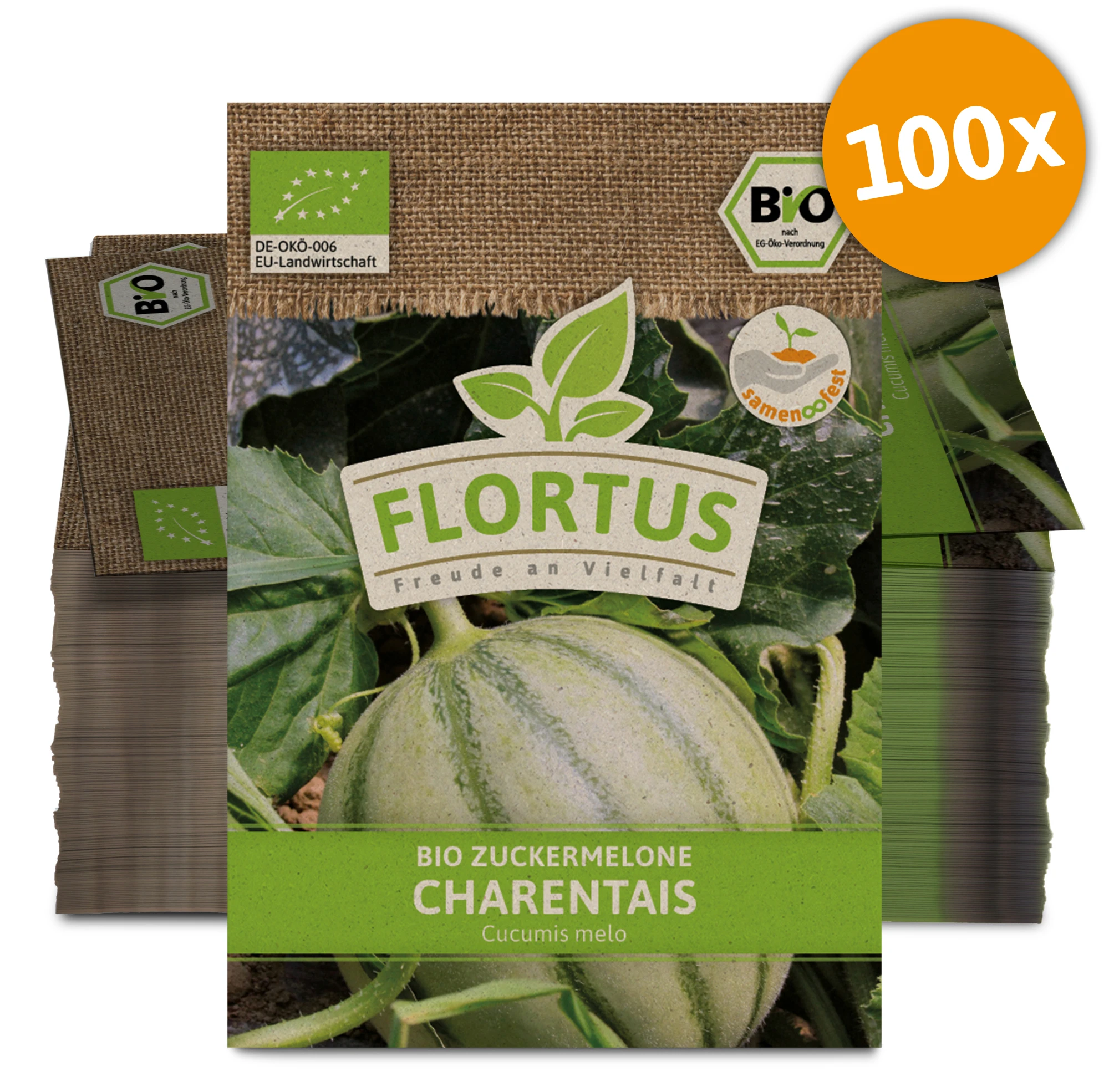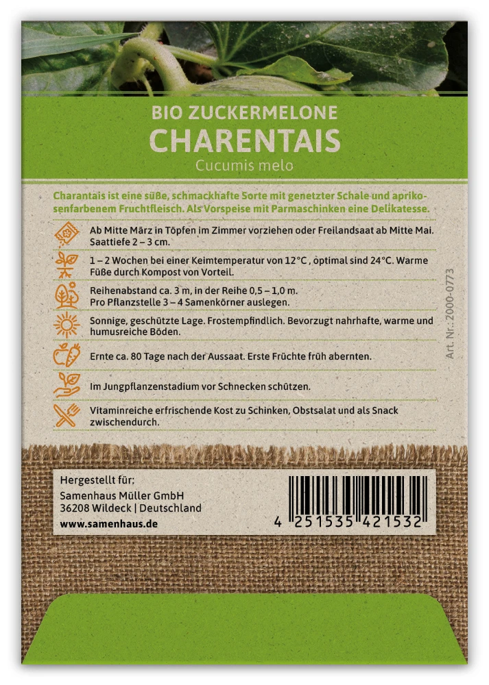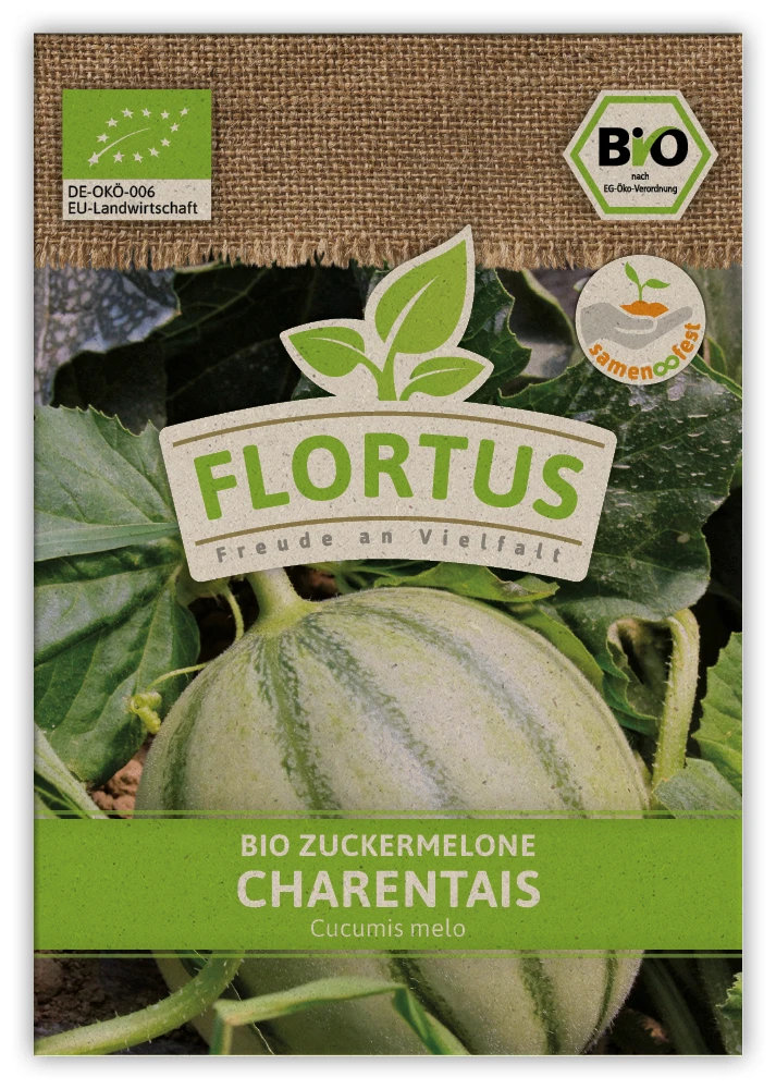 Die BIO Zuckermelone Charentaise ist eine wunderbare süße Melone mit grau-grüner Schale und gelb-orangen Fruchtfleisch. Das Fruchtfleisch ist sehr süß und aromatisch. Die Früchte verströmen ausgereift den typischen Duft nach Melone. Die Melonen schmecken frisch sehr gut. Gerade in Kombination mit Schinken und Käse sind sie ein Highlight. Die BIO Zuckermelone Charentaise sollten Sie rechtzeitig vorziehen. Bereits ab Ende März/Anfang April können die Samen im Warmen vorgezogen werden. Ab Mai werden die Jungpflanzen ausgepflanzt. Charentaise-Melonen können Sie im Gewächshaus, Freiland aber auch auf dem Balkon ziehen. Die Pflanzen bilden lange Ranken und benötigen viel Platz. Da die Früchte relativ klein sind, ist auch ein vertikaler Anbau möglich.